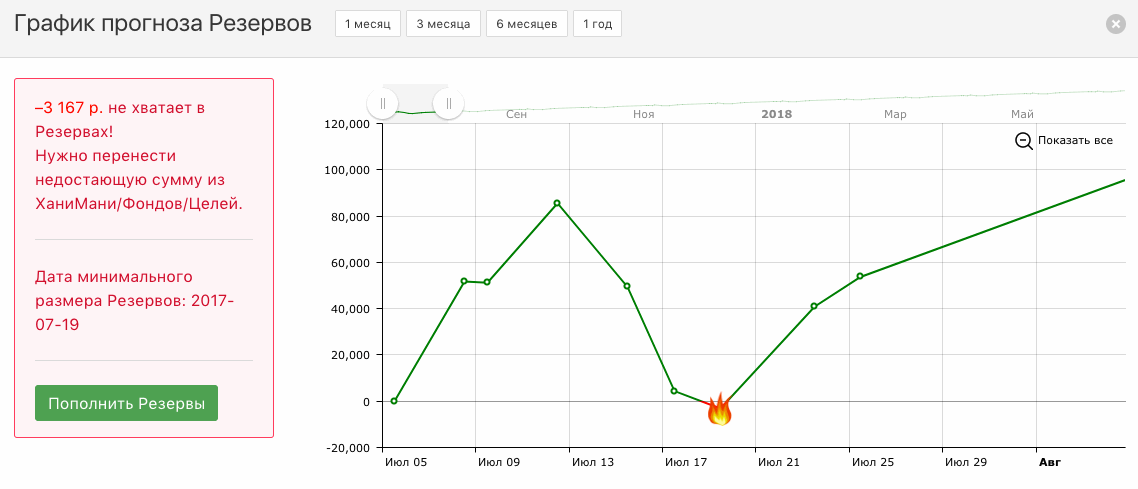 ХаниМани прогнозирует будущие траты на год вперёд и предупреждает вас, если вдруг в будущем не хватит денег на что-то («кассовые разрывы»).